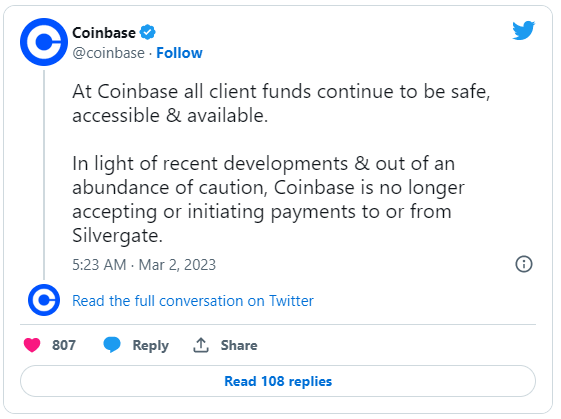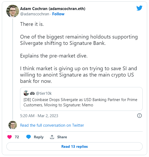 Cinneamhain Ventures的Adam Cochran在推特上表示,Coinbase的举动可能意味着Silvergate的终结。