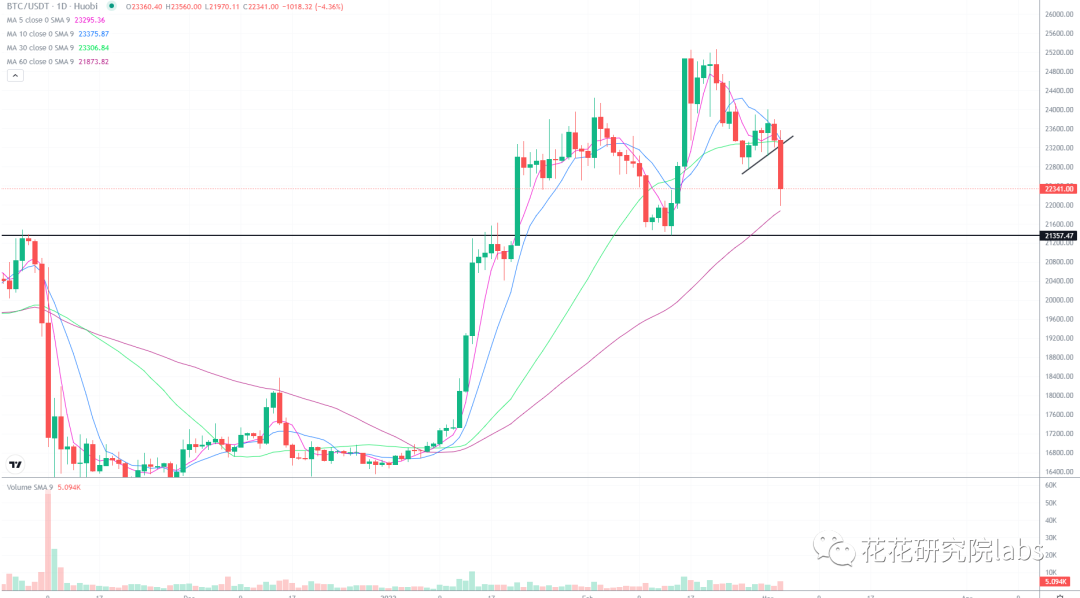 昨天美股上涨比特币没有跟随,走势就有点偏弱,可能是加密友好银行Silvergate爆雷的影响,币价下挫,从技术上看,比特币小时级别也发生了破位,昨天也在直播中提示了,如果小时级别破位短线要及时撤退。