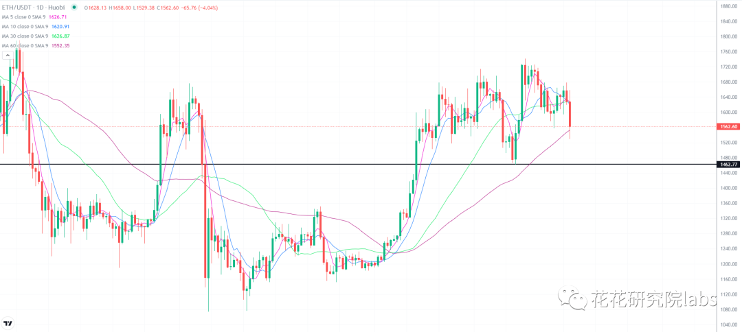 以太坊跌幅低于比特币,相对强势那么一点,短线可以1600低吸一些仓位,最大止损设置在1460.