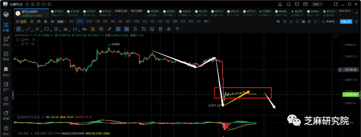 15分钟级别,当前这里在走一笔15分钟级别的反弹,或者构建一个15分钟级别的中枢。从目前走势来看,还会继续向下跌破21971,21971不是回调的终点。下方可以先关注21500,其次是21000的支撑,上方的压力为23000,不突破23000,下跌不会结束。