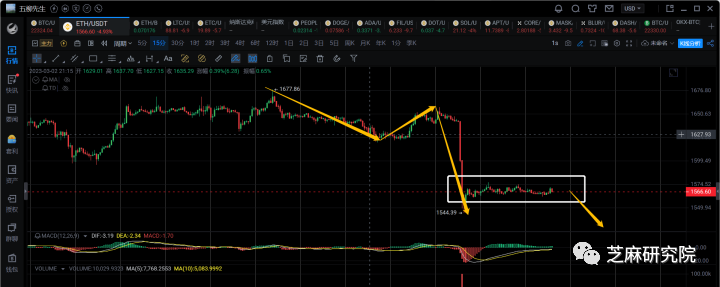 这1h级别的下跌,内部15分钟级别的结构,由于第三笔15分钟的下与第一笔不背驰,所以下跌没有结束,这里可能构建一个15分钟级别的中枢,然后再次跌破1544,去到1500~1520附近。预期明天上午或者傍晚有可能结束1h级别的下跌。短线建议等有底背信号再做多会比较稳一点。上方小级别的压力在1590~1600附近。
