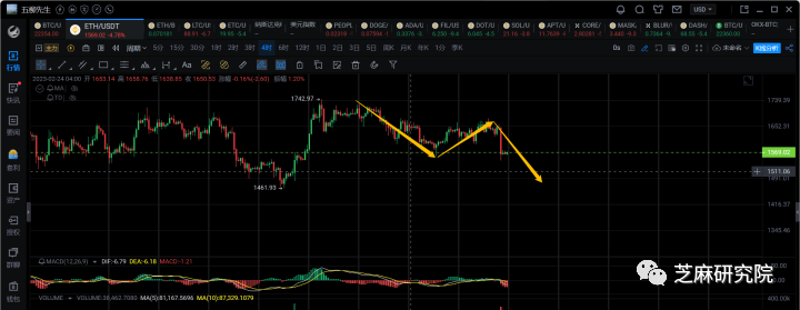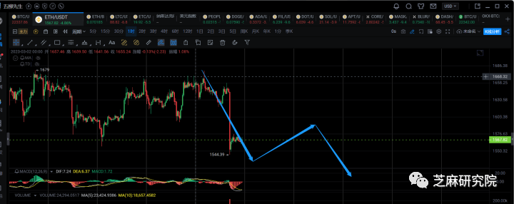 以太1h级别,目前还是第一笔1h级别的下跌,目前还没有结束,预期1520或者1500附近,然后后续还有第二笔1h级别的反弹,以及第三笔1h级别的下跌。