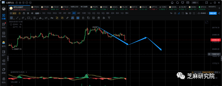 日线级别:整体走日线级别的回调概率已经非常大了,毕竟二月初已经跌过一次,现在第二次下跌,概率会非常大