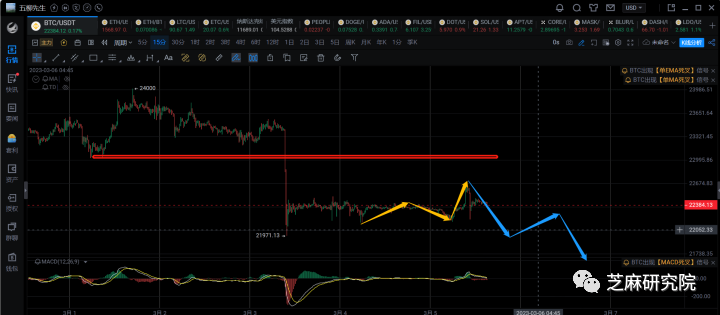 1h级别,这里1h级别的反弹已经走出来了,时间满足,结构满足,所以这里可以预期新的一笔1h级别的下跌,目标看21500附近。由于21000~21500区间的支撑很强,所以这个区间很难一下子跌穿,所以初步可以在这位置附近做短线抄底。