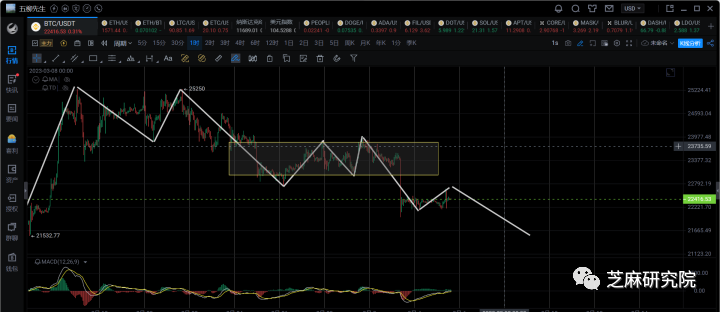 4h级别,这里4h级别的第一笔下跌应该是快要结束了的,正常来说明天可能会结束,然后走第二笔4h级别的反弹,第二笔反弹预期23300附近,只要不突破24200,都是可以继续往下看第三笔4h级别下跌的。