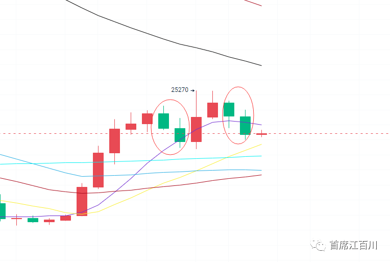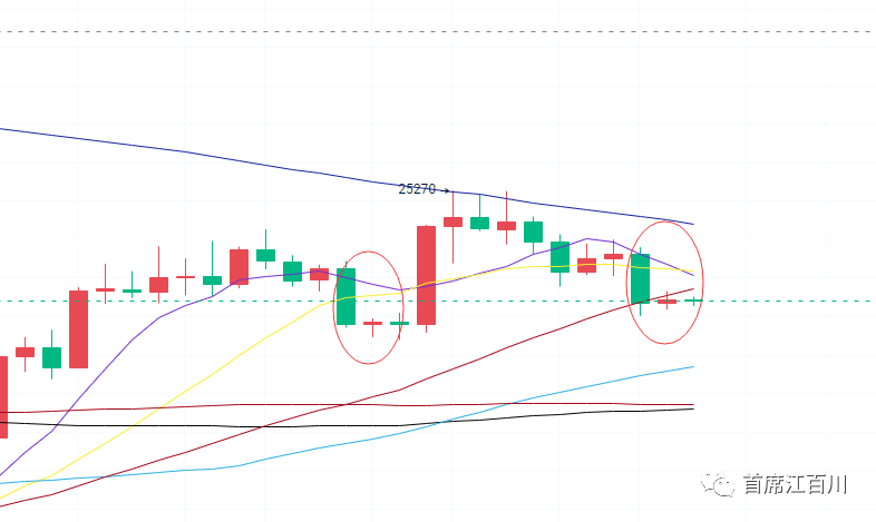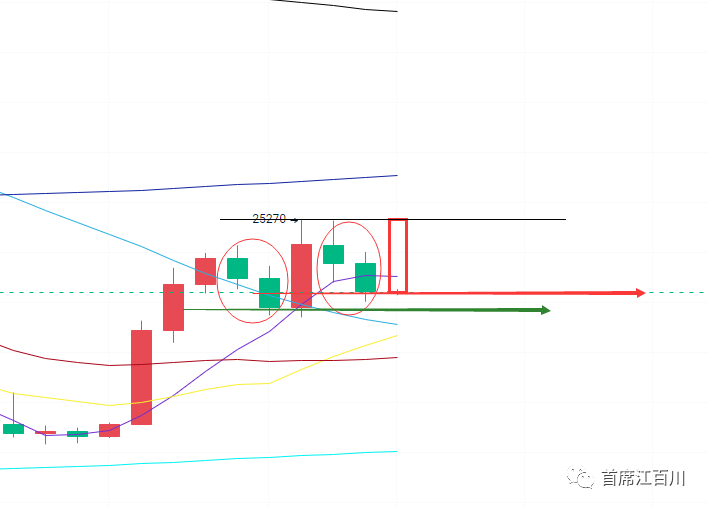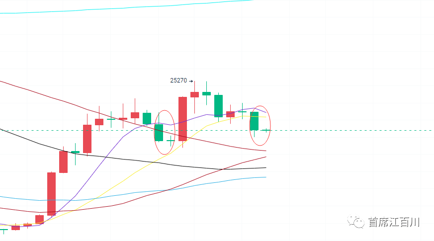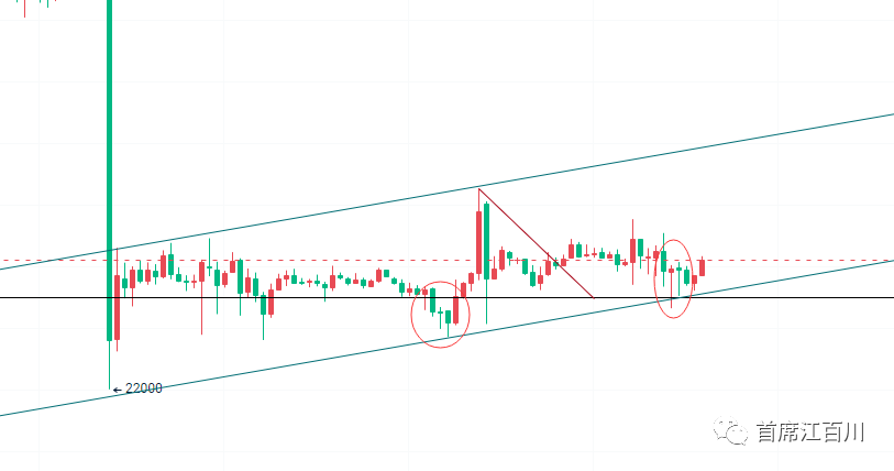 五日线上要么倍阳扭转局面,要么第三个阴线就要出来了,和上次的阳线带长上影线相反,这里就会形成阴线带长下影线,极限支撑在19500-19800美金左右。