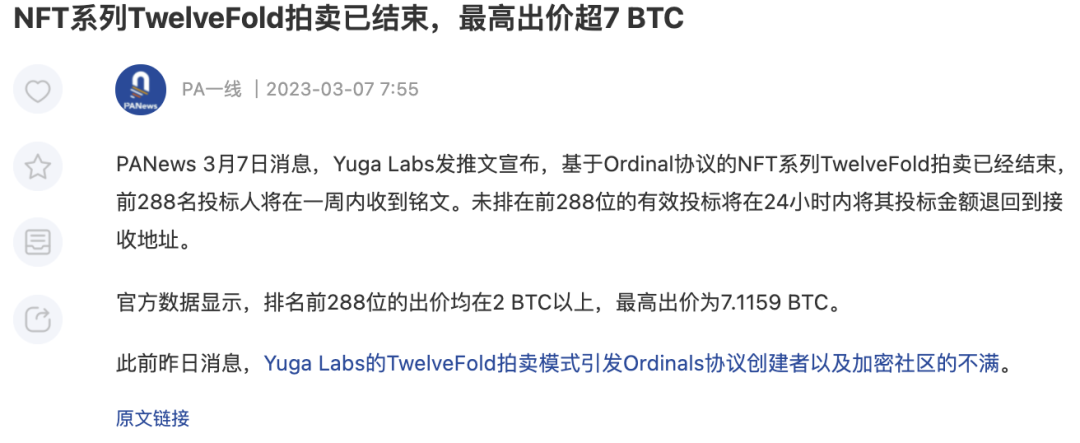 最近什么最火那一定是比特币ordinal协议上面的NFT最火,加上正规军YUGA LABS的发行新NFT的动作,市场都觉得比特币上可能大有可为。你很难想象本来只价值一聪的小铭文(比特币上的NFT的叫法)最高出价为7.1159 BTC。