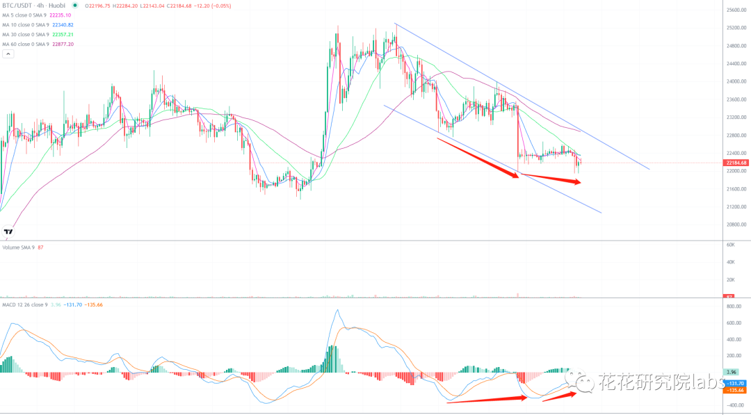 昨天鲍威尔讲话偏鹰,市场应声下跌,比特币出小新低之后快速反弹,下方买盘强劲,四小时macd已经双重底背离,若能借助背离突破四小时的下降走势,有希望开启新一轮的上涨,结构上不破21350中线继续看涨。