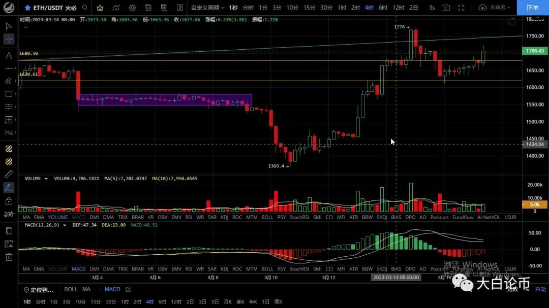 以太坊整体走势较弱完全看大饼脸色,昨日波动不大呈震荡上行走势,早间有效突破1680阻力后加速拉升一波,最高触及1724一线未能延续承压回落,昨日空单小幅获利,目前币价在1705附近运行,四小时级别来看行情整体处于宽幅区间震荡,macd空头缩量减弱多头增强,ma均线拐头向上指引,上方关注1720压力区域不破会先走回调,有效突破则关注1750附近,日线级别多头运行但量能不足,短期将会延续震荡走势,随后回踩支撑再破高点,有机会到1810附近,这是个人预期走势,日内思路建议先空后多,上方压制1720-1750,下方支撑1680-1650