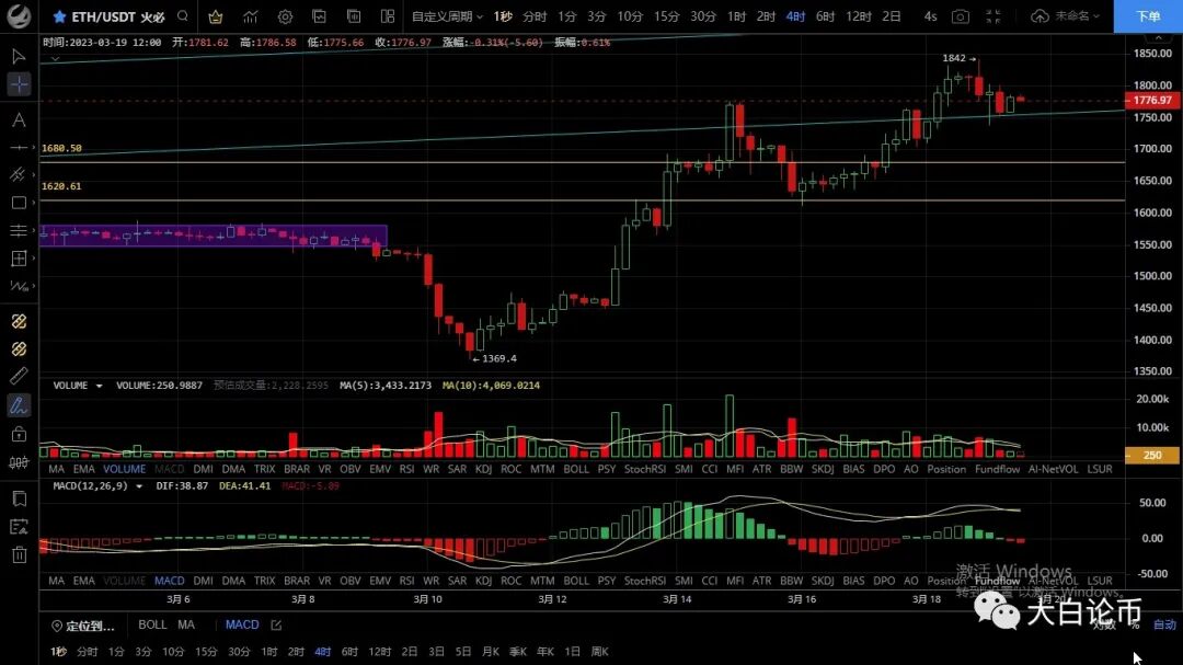 以太坊昨日补涨再次破位前高,最高触及1842一线形成背离结构迅速回落,最低跌至1737一线支撑反弹,恭喜跟上昨日思路的朋友空单获利100点,目前币价在1778附近运行,四小时级别行情虽再次破高但量能却未能跟上,形成四小时顶背离,短期多头滞涨,macd转为空头双线死叉,但下跌力度不明显,ma7拐头向下形成压制,短期行情陷入震荡走势,重点关注周k收线若收在趋势线上方,后市则回踩1700开多,若收在下方则反抽开空,波段的话关注进场点位1930-2000区域,给到机会的话预计有100-200点回撤,日内思路稳健者观望激进逢高做空为主低多为辅,上方压制1800-1830,下方支撑1760-1730