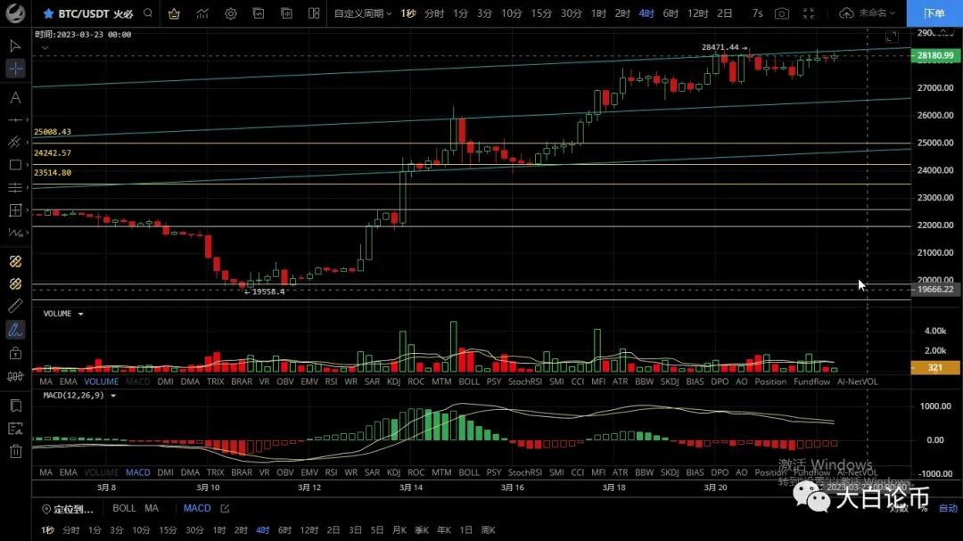 大饼整体呈震荡上行走势,昨日最低跌至27312一线支撑反弹,凌晨行情再次上攻但未破前高,最高触及28443一线承压回落,目前币价在28160附近运行,四小时级别行情整体沿上方通道线运行,但始终无法突破,短期空头回踩力度减弱,底部逐渐抬高,同时高点也在降低,幅图macd空头逐步缩量双线聚拢,整体呈高位震荡走势,日线没什么变化依旧被通道线压制没有实质性突破,后市需要关注行情会向上插针然后迅速下跌,确定顶部进入回踩,这是个人预期的一个走势,重点注意凌晨消息面影响到时顺势而为,预计会有不小的波动,日内思路建议稳健者观望,上方压制28700-29300,下方支撑27100-26500