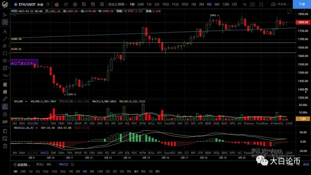 以太坊昨日走势较强,低位跌至1717一线后反弹,随后行情连阳上行再次领涨,最高插针至1835一线迅速回落,目前币价在1797附近运行,四小时级别行情连阳上行吞没前期跌幅,可见多头较为强势,但上方阻力较强难以突破,反弹高点逐渐降低,macd空头转多双线粘合,ma均线上扬,目前行情处于高位震荡多空都有可能,日线级别价格回踩后迅速收回,行情呈阴阳交替走势,昨日守住1700关口上涨趋势未被打破,若再次给到机会不破的话可考虑进多,预计白盘波动不会大,重点关注凌晨加息影响,决定关键方向的时候到了注意风控切勿抗单,日内思路建议顺势而为,上方压制1880-1930,下方支撑1720-1670