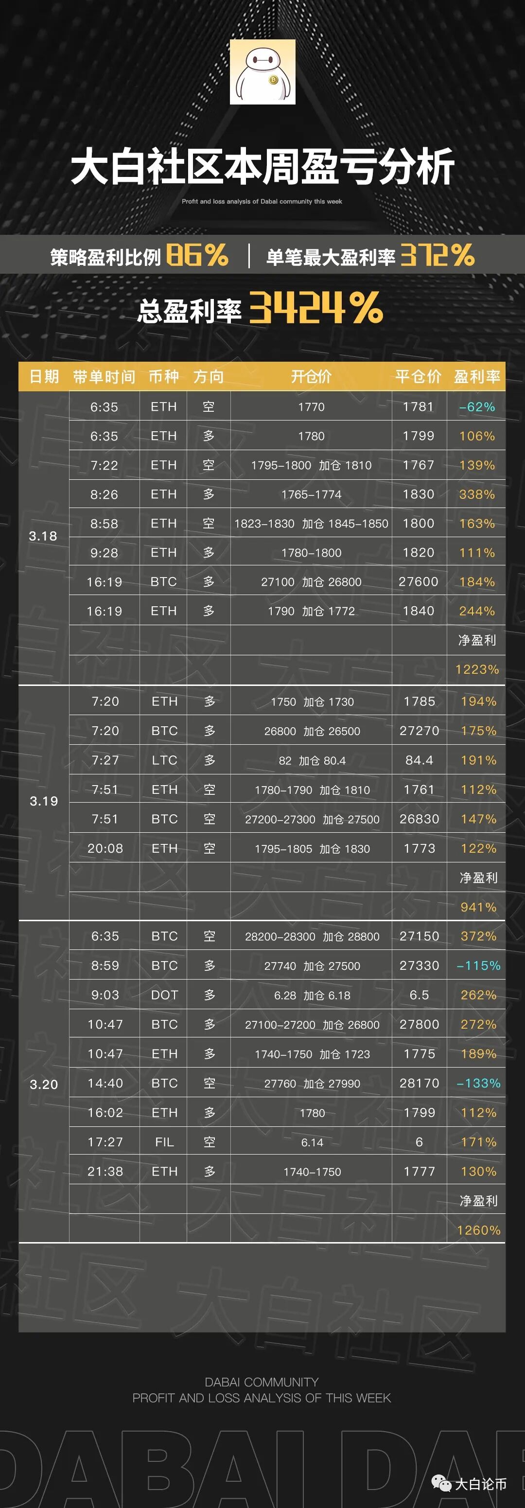 下方是大白社区本周实盘群单子,恭喜跟上的币友,如果你操作不顺,可以来试试水。