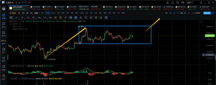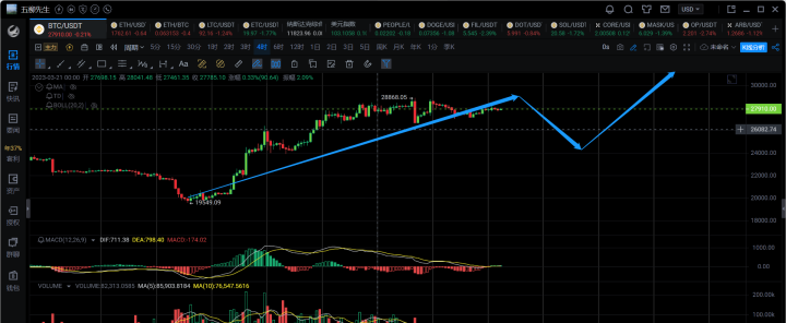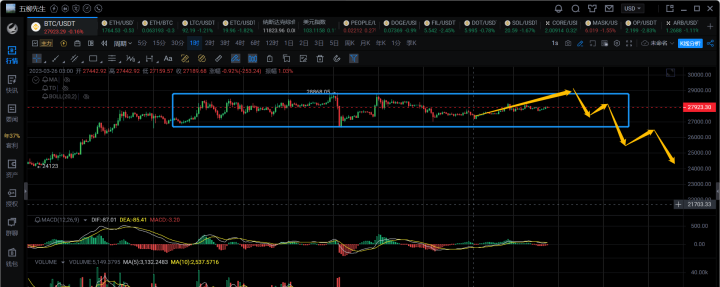 4h级别,当下一直维持在29000下方震荡,说明上方受到了较大的压制,这里个人还是倾向于4h级别的第一笔反弹即将终结,很快会迎来一笔4h级别的回调,目标看24200附近。除非说,短线它能够快速的突破30000,只要不能加速拉升,向下变盘的概率就会变大。