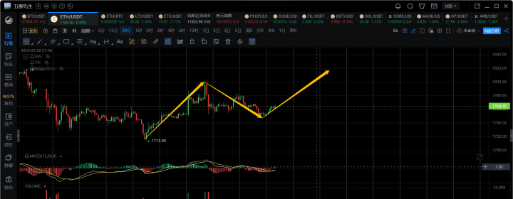 以太这里看是否再冲一波1800上方吧,如果能够再冲上一波,整个1h级别的反弹其实就比较完美了。15分钟级别,如果再跌破1735,那反弹大概率就结束了。不跌破之前,这里还有机会再次向上反弹。上方压力,1840附近,1900。下方重要支撑1700.