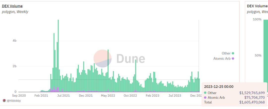 在 Polygon 网络上的套利交易占比更高,并且交易量显著大于三明治攻击。