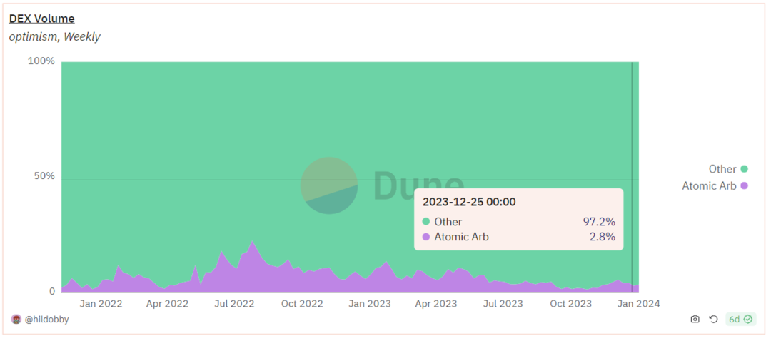 在 Optimism 上,套利交易的比例在 2% 到 4% 之间,与去年相比显示出下降趋势。套利交易的交易量相对较低。