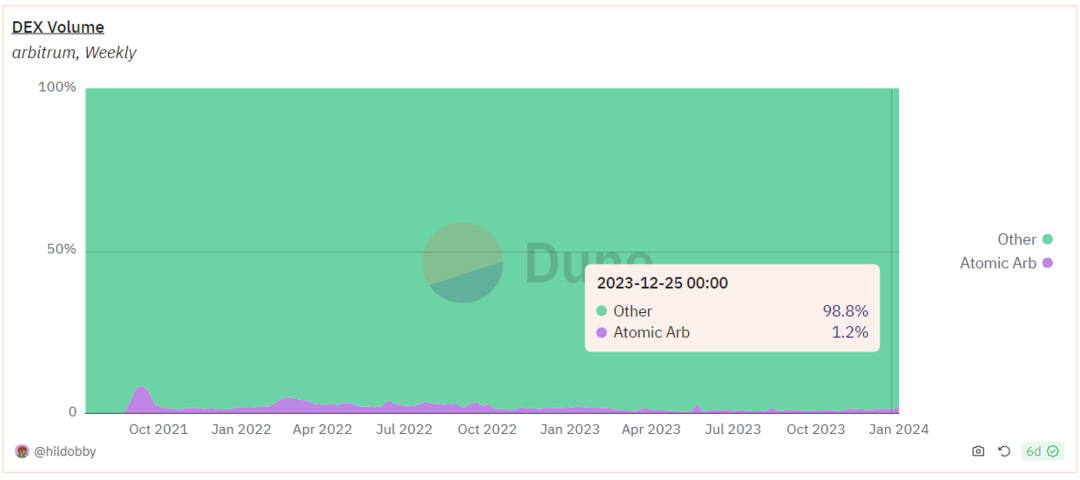 与其他链相比,Arbitrum 上的套利交易比例相对较小。然而,与 Arbitrum 上的三明治交易相比,套利交易的交易量仍然要大得多。
