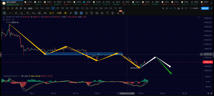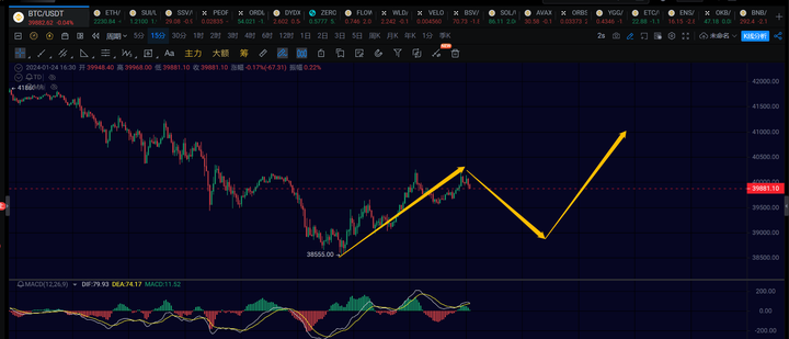 15分钟级别,目前第一笔15分钟级别的上应该差不多了,这里应该要走第二笔15分钟级别的回调,回调关注38800~39000附近。之后应该还有第三笔15分钟级别的反弹。第三笔反弹就需要观察力度了。先看41000能否到。