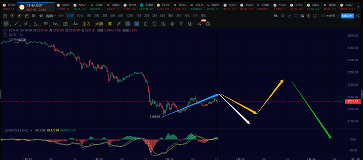以太的走势暂时还是比较弱的,当前15分钟级别的反弹目前只到了2250附近。短线看下一笔15分钟级别的下跌是否继续新低破2168,不破2168的话还会有一笔15分钟级别的上去2300附近。以太这里就算走出了1h级别的反弹,预期还会有一笔1h级别的下跌出新低才能结束4h级别的下跌。