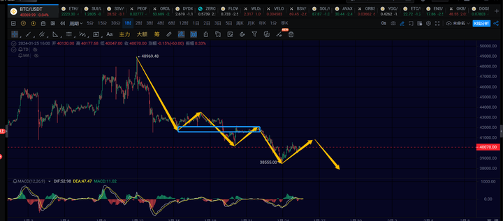 大饼目前还是在运行一笔1h级别的反弹,这里的反弹力度比预期的差了些,预期这笔反弹再冲一波41000可能就差不多了。之后应该会有一笔1h级别的下跌再次破下38555创个新低,然后再开始走一笔4h级别的反弹。