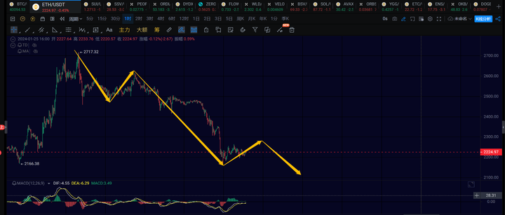 以太的走势是比较弱了的,当前1h级别的反弹够呛能够突破2300,目前1h反弹结构还没有完全的走出来,如果再去一趟2260~2300区间就比较完美了。之后应该还会有第五笔1h级别的下跌,这笔下跌关注2100附近。预期第五笔1h级别的下跌结束以后,短期会迎来一波小幅度的反弹行情,即走一笔4h级别的反弹。