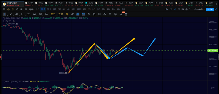 15分钟级别:方向向上,保持在39500上方的话应该还有机会冲一波
