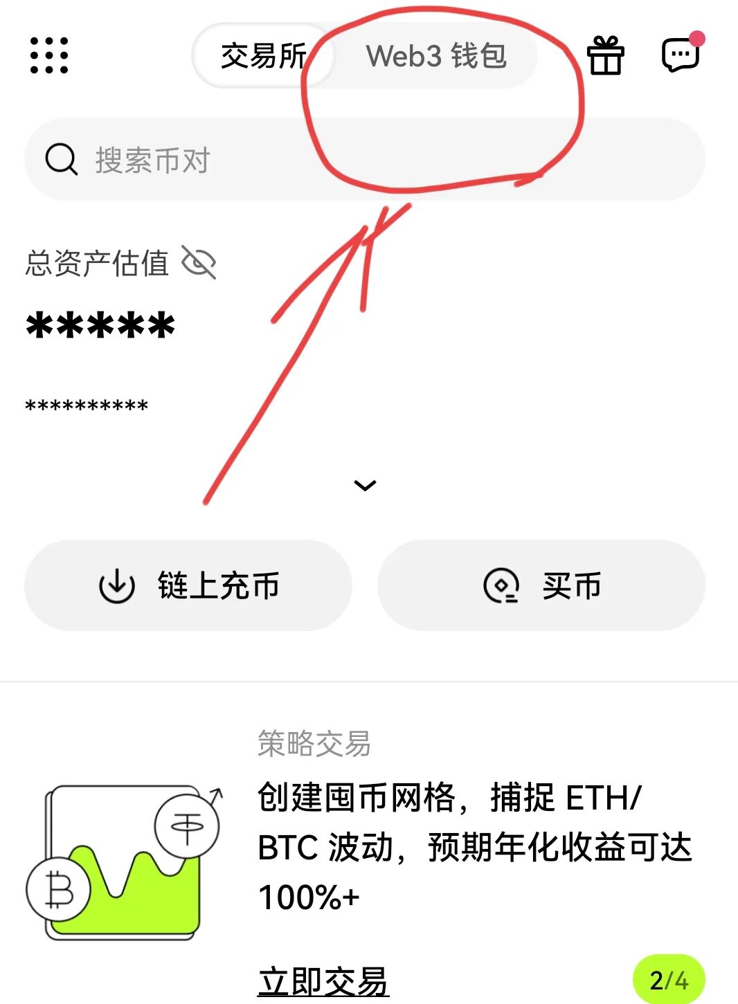 下载安装完成,进入软件内后,点上方的“Web3钱包”切换到钱包。