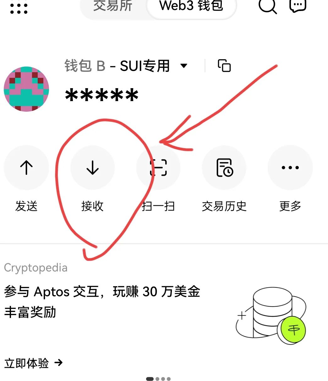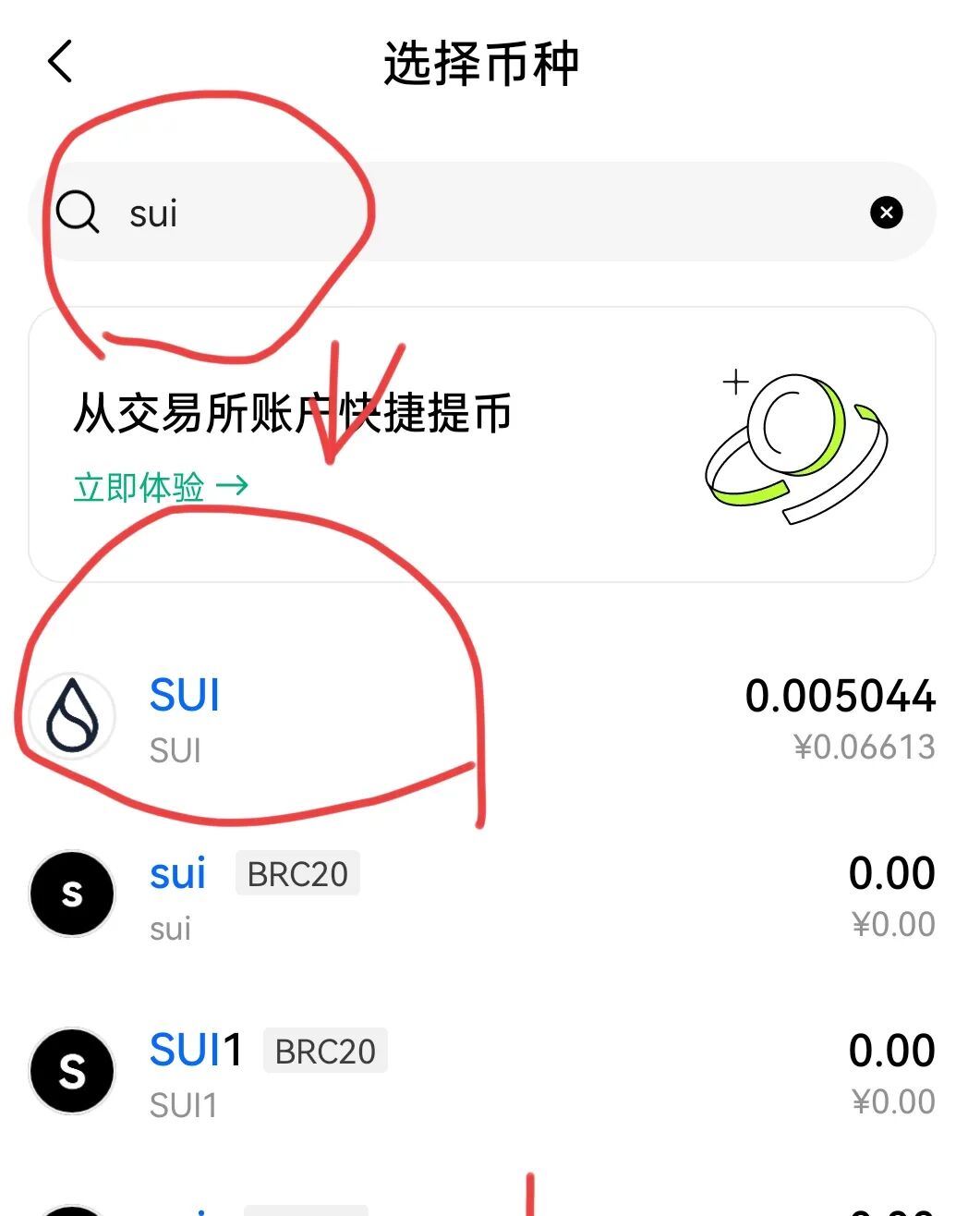 创建好钱包后,点“接收”,选择币种里搜索“sui”,找到第1个,进入后就会显示钱包地址和二维码,交易所提币到这个地址即可。