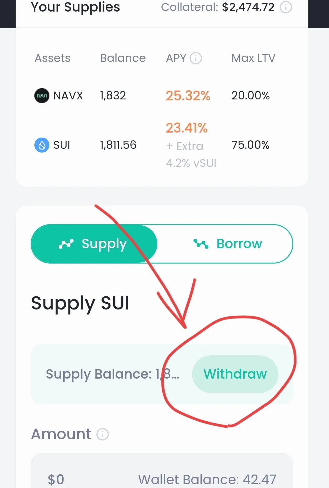 进入原navi网站,点“Withdraw”,输入要取回的数量,再点下方的“Withdraw SUI”按钮,授权后,取回SUI。