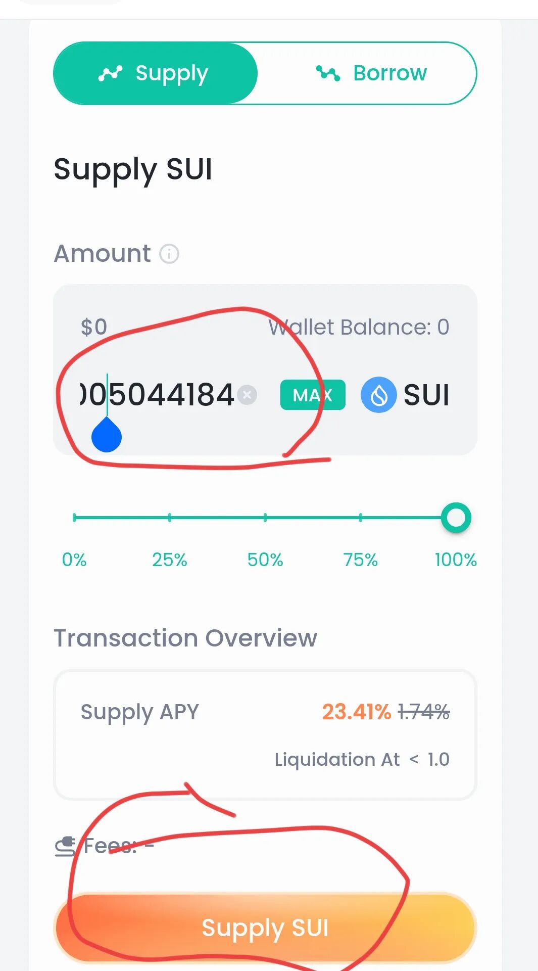 再往下拉,Amount下方填入数量,再点“Supply SUI”,弹出授权页面,点“确定”。(注:数量要略少于总数以用做GAS费,而一旦点确定,您的这部分资产将质押到平台内,以后需要解除质押才能取回)。