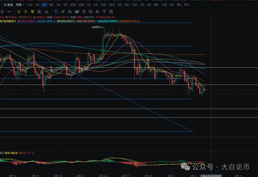 大饼日线昨日走出回调 最低向下插针至55600附近 最高上插至58300附近 收线在56200附近 中期底部价格大约在53800附近至MA360年线附近 给到机会可在附近进行建仓接多 上方压力位于MA7均线附近 高点可看至MA30附近 MACD空头增量 四小时上方压力位于MA30附近 突破可看至MA200附近 MACD空头缩量 有形成金叉的迹象 中线给至53880-52600附近可进行接多 反弹目标可看至57200-59500附近