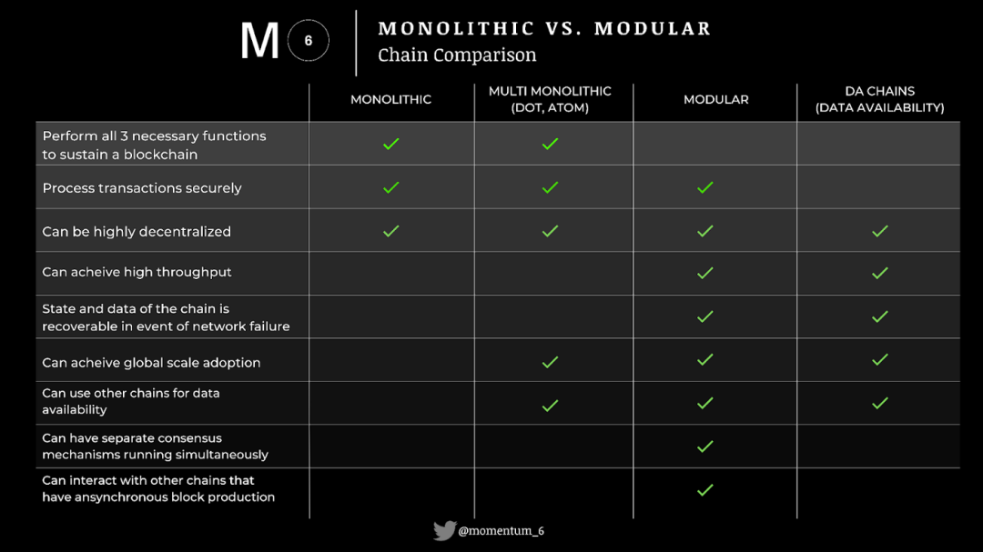 这三个模块化区块链和单体区块链的大方向不同, 特色也各不相同: