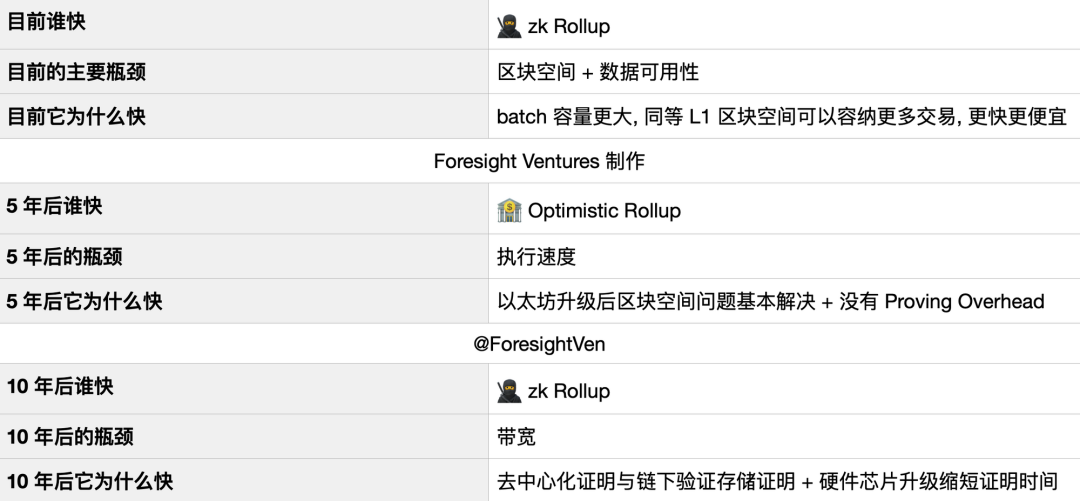 当时得出的结论是: 因为没有 Proving Overhead, Optimistic Rollup 在长远视角下会远胜于 zk Rollup. 但是其实在不同时间段的发展上, Optimistic 和 zk Rollup 的性能实际上会交替领先: