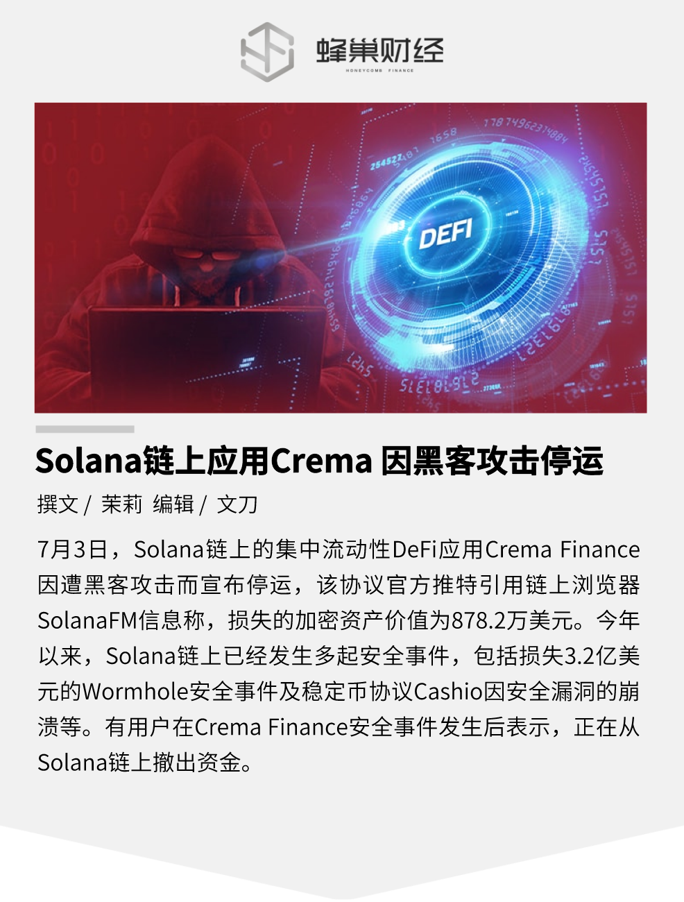 7月3日,Solana链上的集中流动性DeFi应用Crema Finance因遭黑客攻击而宣布停运,该协议官方推特引用链上浏览器SolanaFM信息称,损失的加密资产价值为878.2万美元。