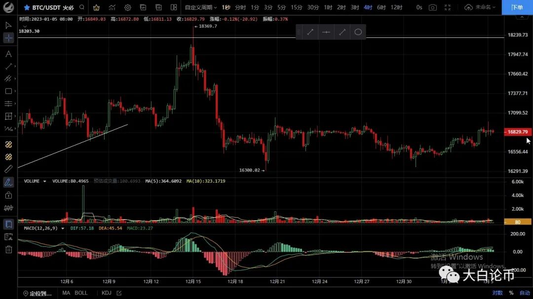 大饼整体走势比以太坊偏弱,昨日早间行情向上拉升晚间多头发力最高触及16980附近承压迅速回落,恭喜跟上昨日空单的朋友获利200点,目前币价在16827一线运行,小时级别行情冲高回落后陷入震荡,macd空头运行双线死叉向下,短期来看多头暂时滞涨,上方17000压制较强,当前需要关注ma30支撑情况有效破位则还会下行,四小时级别走势和一小时一致处于高位震荡整理,macd多头逐步缩量快线拐头向下,ma7向上指引,但反弹缺乏力度上方阻力较强,预计会先走回踩,日内思路建议回踩做多,上方压制17000-17400,下方支撑16700-16300