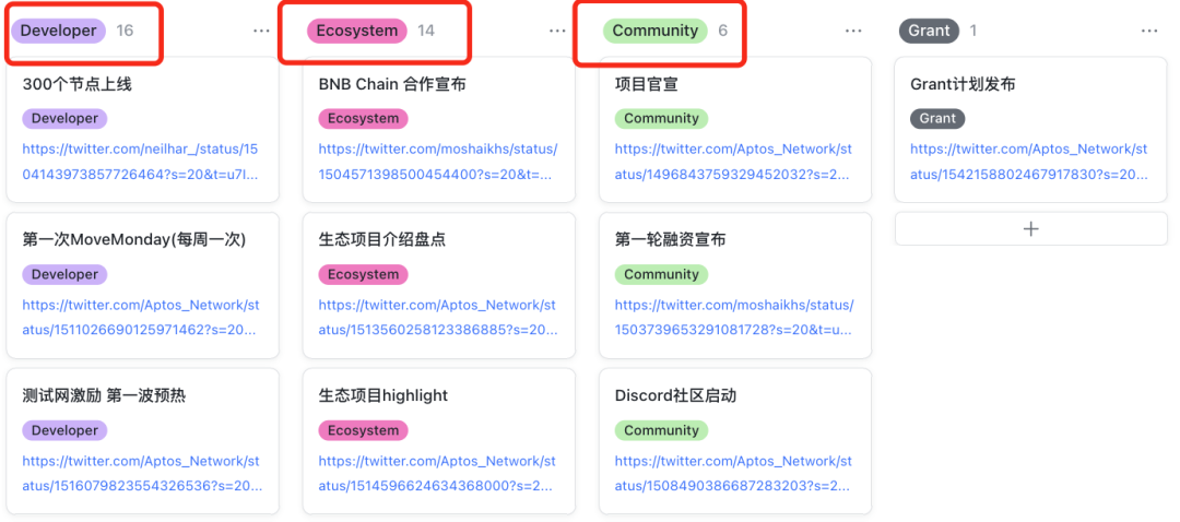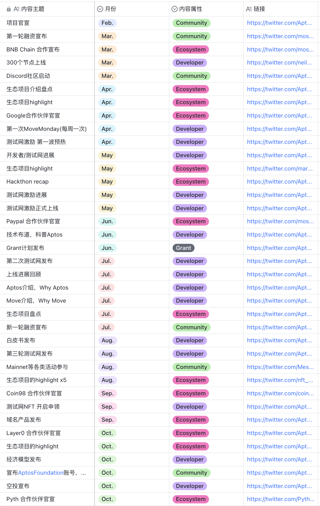 从 Aptos 的推特/medium/Discord来看,推特的信息基本包含了其他渠道的所有内容,因此我们首先对 twitter 的运营内容做了mapping,并对重点部分做了梳理。