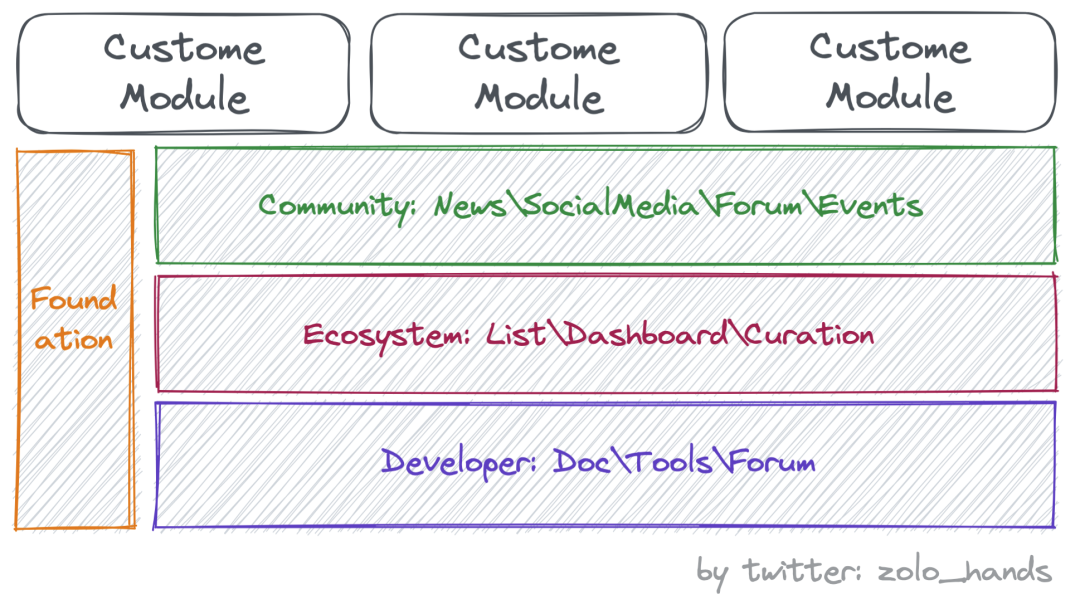 社区建设是 Web3 项目的重中之重,社区并不仅仅是简单的拉社交群组,每周举行 Town hall 就结束,从几条公链的运营来看,从大的模块出发,至少应该包含:
