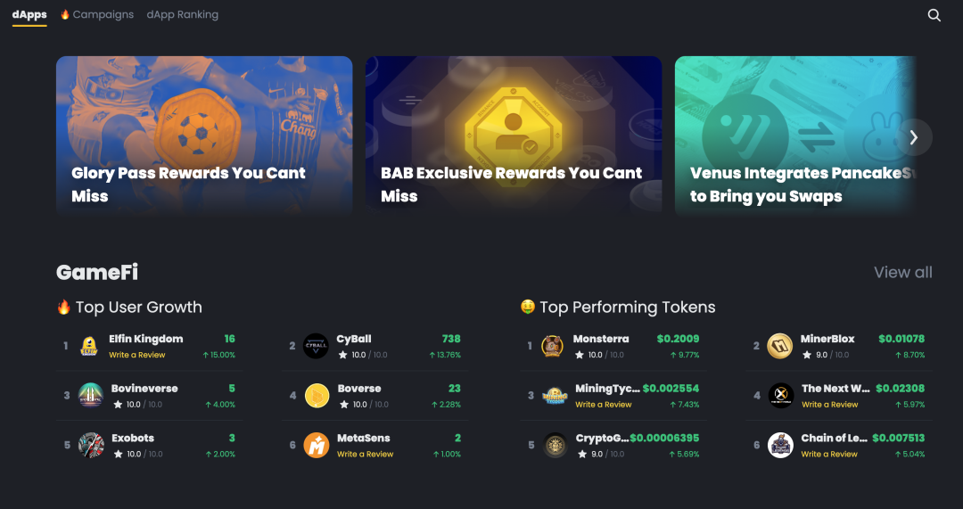 相比之下,BNB Chain 的生态部分建设最为完善和不同,他们在以「应用商店」的思路,打造自己的生态板块。你可以把他理解为是,包含了「资讯+点评」功能的 DappRadar。不仅仅只是呈现项目,还呈现了数据、用户的反馈等维度,甚至基于有风险的项目,还提供了 Alert 功能。BNB Chain 的生态运营,已经和其他的公链拉开了更大的差距。