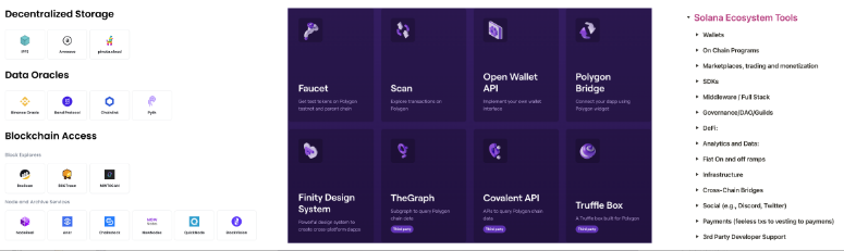 除此以外,BNB Chain/Polygon/Solana 还非常清晰和分类别向开发者展示了,在自己网络上开发所能使用到的各类型工具。