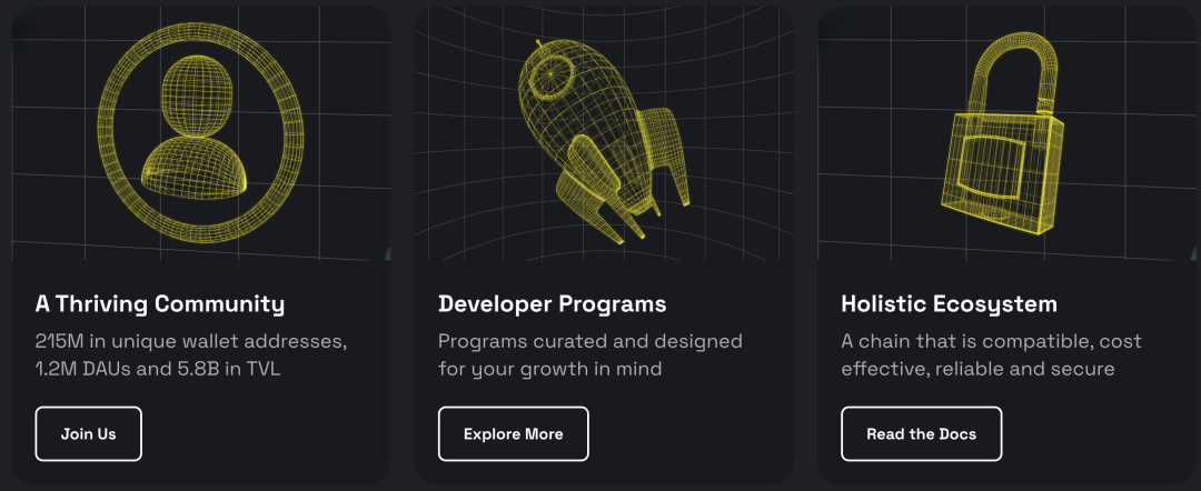 Migrate 的目标并不是针对新项目,而是针对已有项目在吸引他们做迁移。进入模块后,他会通过告诉你这里对开发者有更多的扶持、用户、TVL 等数据很高等方式来吸引你,同时加上成功Case,让你也开始期待自己在迁移后,也会取得同样的成功。最后再加上 Build on BNB Chain 进行线索转化。