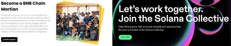 为了更好地激活社区活力,让更多用户成为公链的布道者。公链方往往还会针对个人设置一些ambassador计划,让更多忠实的用户参与进来。BNB Chain 和 Solana 分别制定了 Martians Program、The Collective,并配置了精神激励 + 物质激励。