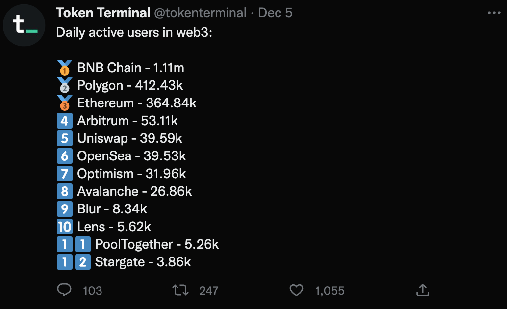 同时针对 BNB Chain 用户多的现象,除了我们常想到的 Binance 本身的流量之外,也能看到目前 BNB Chain 不管是从开发者、生态还是社区来讲都是建设的最好的。Avalanche 虽然一直在聊其共识/Subnet 上的创新性,但用户量/生态一直没起来,也许从运营角度也能看到确实有不少的不足之处。