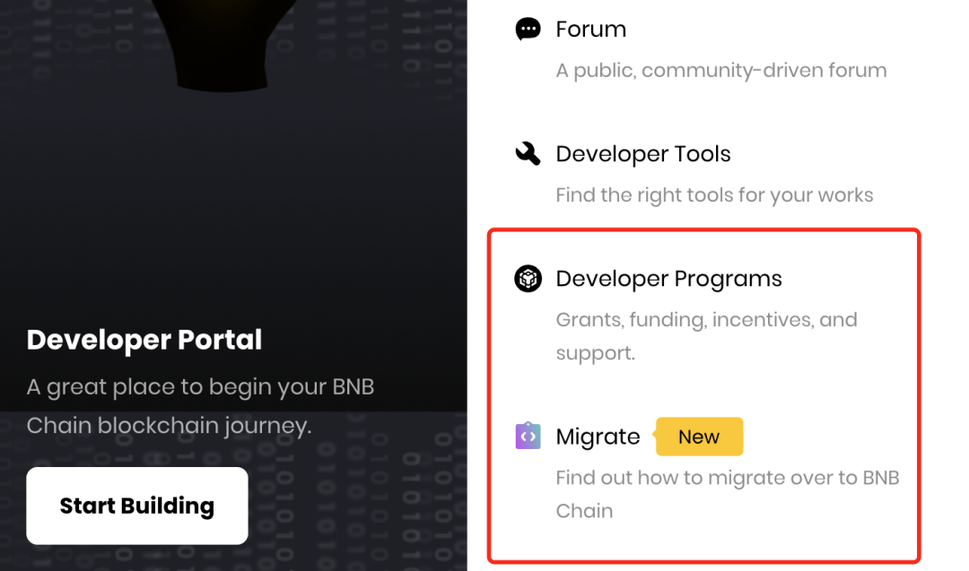 虽然 BNB Chain 不怎么讲技术创新,但很多朋友应该对 BNB Chain 的 MVB、孵化计划等非常熟悉。事实上,这部分属于 Developer Program 里对开发者的扶持,BNB Chain 甚至还有针对开发者有单独的 Monthly Grants。同时为了承接更多新的项目部署到 BNB Chain,官网上还专门新增了一个 Migrate(迁移)模块来进行引导。