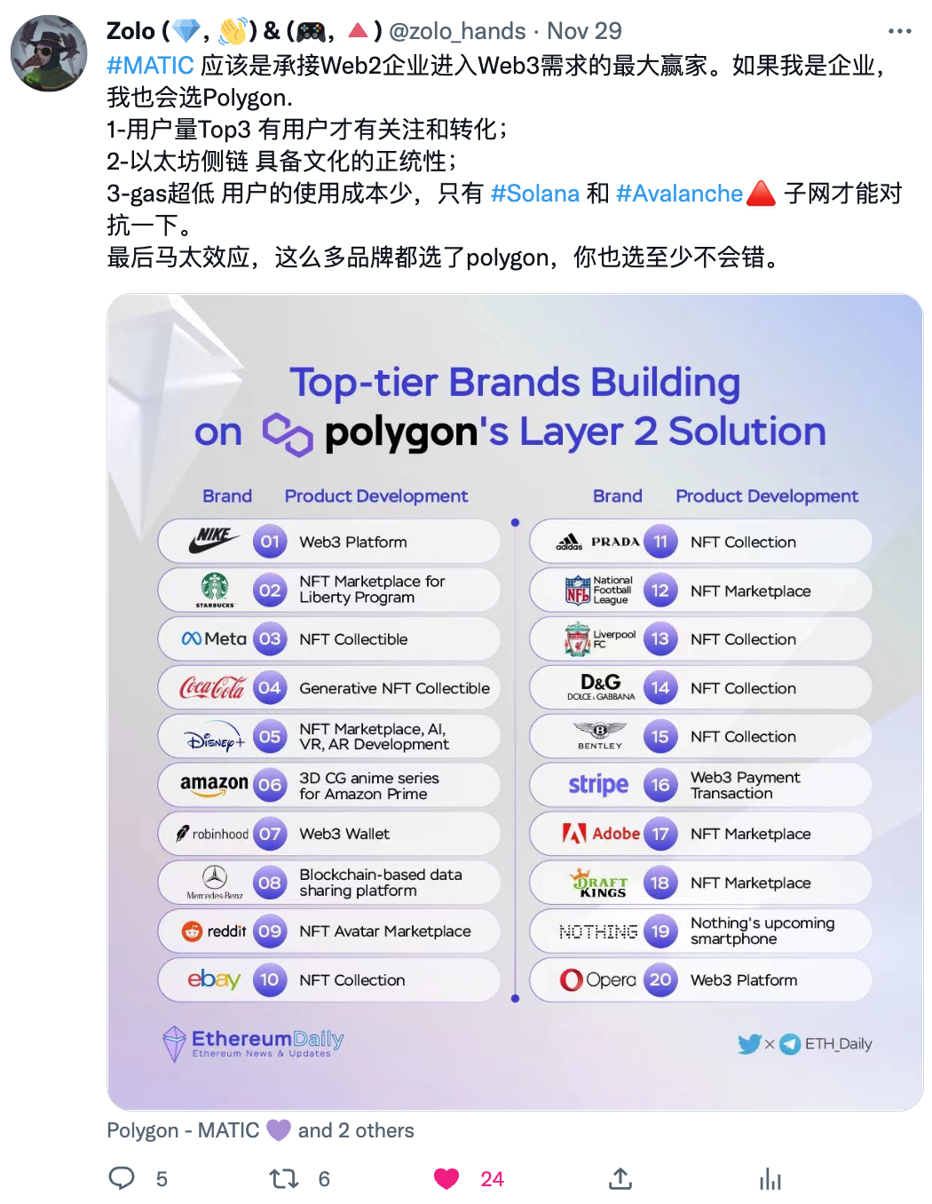 因此,如果有更多 Web2 品牌选择基于 Polygon 进行构建,或有意愿进入 Web3。针对这样的独有优势,Polygon 其实完全也可以考虑做自己的「合作伙伴墙 + Case 解读」来吸引更多的品牌合作,作为强 BD 的一个资料库,类似高配版的 Avalanche Subnet Casestudy。