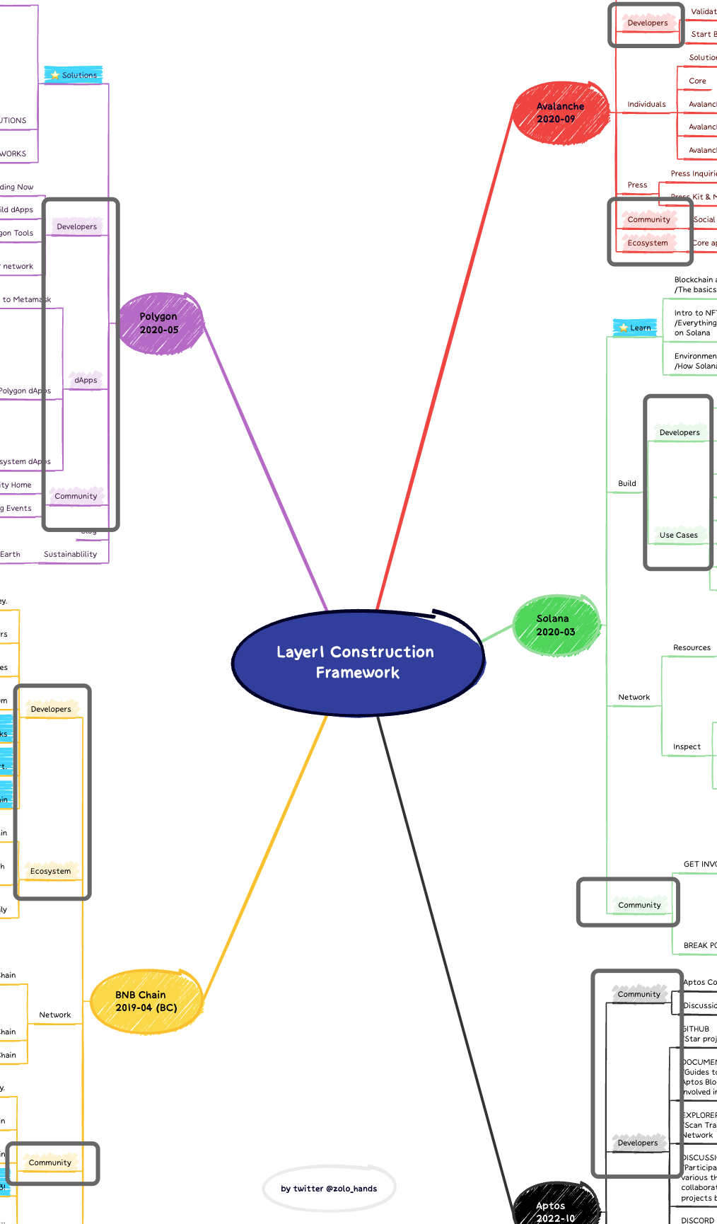 当然,公链的范围也不仅仅是停留在上面的这些 Layer1,还包括更多的 Aleo、Mina 等特殊属性的公链,或者从广义上需要开发者、自建生态的项目。公链类项目建设周期长,本篇文章试图通过梳理相对头部项目的运营模块,探索出一些有实践性的方法论,并对比较好的 Case 进行 highlight 分享,希望能对长期的项目建设有所帮助,欢迎 DM Twitter @zolo_hands \ @linda_guagua 一起交流。