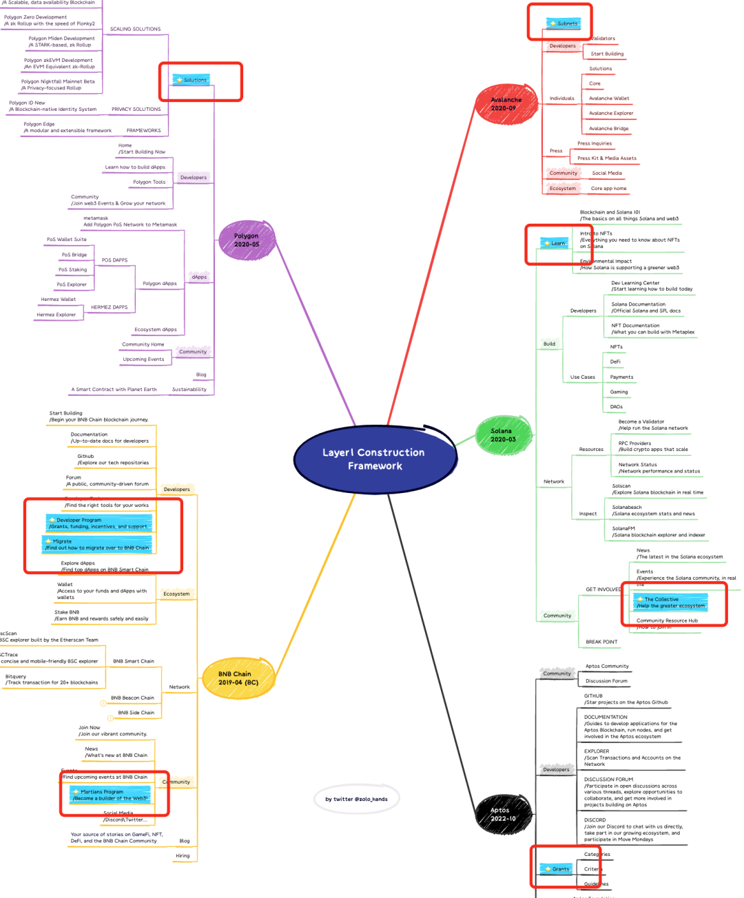 外因比如 FTX 的暴雷,让 Solana 受到影响;Binance 的流量反补到 BNB Chain 的增长;过于高光的团队和资方背景,让 Aptos 在早期就获得了不少关注等。但纠结外因并不是此文目的,本文将更多从不同公链的官网模块、Social Media、社区运营角度入手,探索更多内因,了解作为公链型项目,应该做好哪些运营建设以及差异化的 Case 值得借鉴。