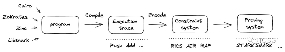 笼统地来说,编译器会逐步将编程语言翻译成机器代码。在ZK的环境下,它指的是使用C、C++、Rust等高级语言编译成约束系统(R1CS、QAP、AIR等.)的低级代码表示。有两种方法,