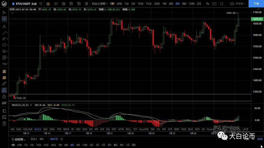 以太坊昨日走势跟大饼一致,插针至1555一线后迅速拉升突破1620阻力,随后延续多头走势一路上行,最高触及1696一线承压回落,恭喜跟上昨日思路的朋友多单获利近150点,目前币价在1670附近运行,四小时级别k线连阳突破前期高点,macd绿色能量柱逐步放量双线呈金叉状态,多头表现较为强势,关注四小时收线是否有效突破震荡区间,如突突行情将进入下一阶段,上方1700未破前切勿追高,日线一直处于高位空头逐步缩量若形成顶背离,预计会有一波不小的回踩,稳健还是回踩后做多,前高不破再进空,上方压制1700-1730,下方支撑1650-1620
