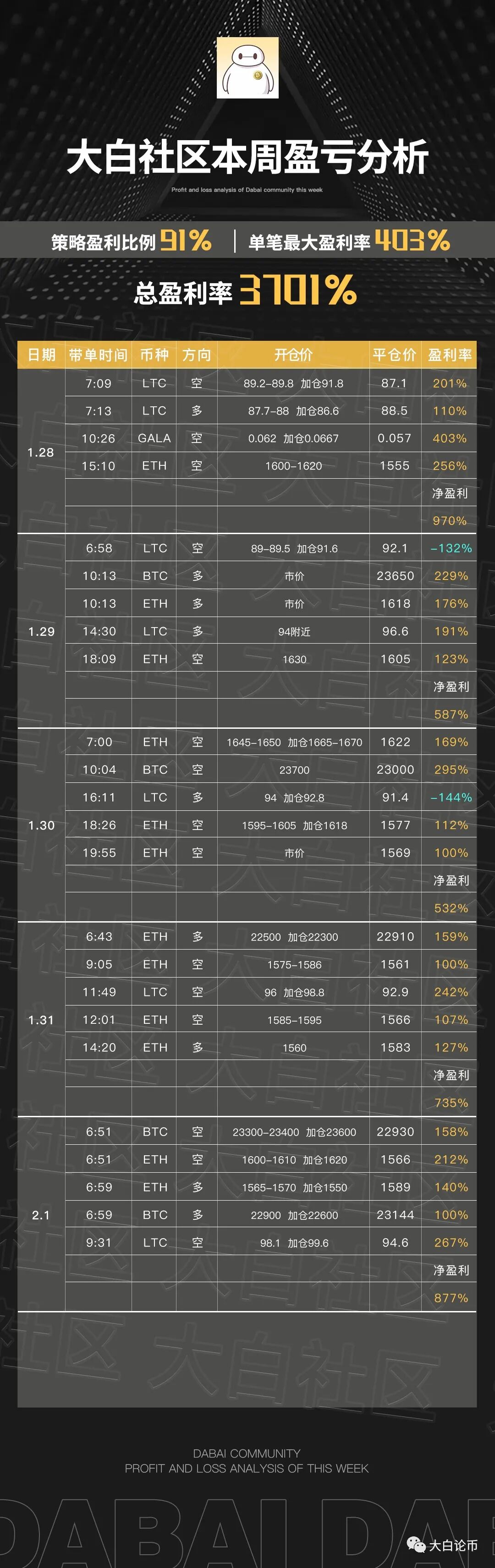 下方是大白社区本周实盘群单子,恭喜跟上的币友,如果你操作不顺,可以来试试水。